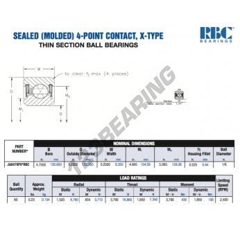 Łożysko Kulkowe, znane jako JA047-XP0-RBC RBC, ma średnicę wewnętrzną 120.65mm, średnicę zewnętrzną 133.35mm i grubość 6.35mm.