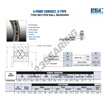 Łożysko Kulkowe, znane jako KA050-XP0-RBC RBC, ma średnicę wewnętrzną 127mm, średnicę zewnętrzną 139.7mm i grubość 6.35mm.