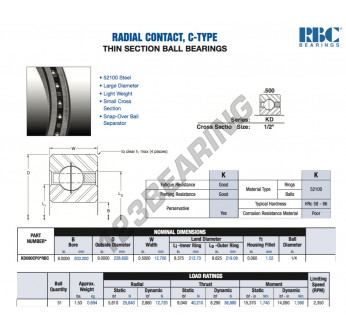 Łożysko Kulkowe, znane jako KD080-CP0-RBC RBC, ma średnicę wewnętrzną 203.2mm, średnicę zewnętrzną 228.6mm i grubość 12.7mm.