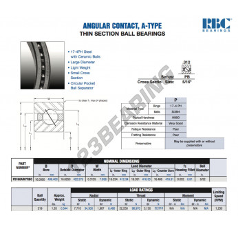 Łożysko Kulkowe, znane jako PB160-AR0-RBC RBC, ma średnicę wewnętrzną 406.4mm, średnicę zewnętrzną 422.275mm i grubość 7.938mm.