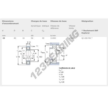 Łożysko Kulkowe, znane jako QJ208-MA-SKF SKF, ma średnicę wewnętrzną 40mm, średnicę zewnętrzną 80mm i grubość 18mm.