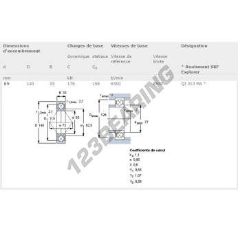 Łożysko Kulkowe, znane jako QJ313-MA-SKF SKF, ma średnicę wewnętrzną 65mm, średnicę zewnętrzną 140mm i grubość 33mm.
