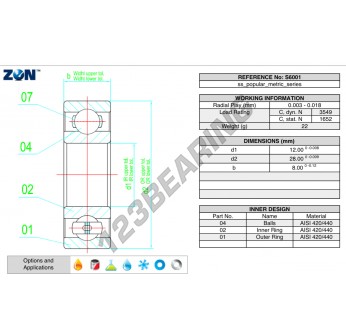 Łożysko Kulkowe, znane jako S6001-ZEN ZEN, ma średnicę wewnętrzną 12mm, średnicę zewnętrzną 28mm i grubość 8mm.