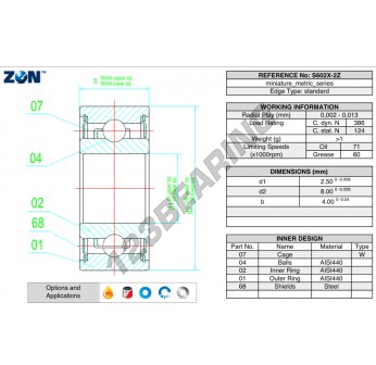 Łożysko Kulkowe, znane jako S602X-ZZ-ZEN ZEN, ma średnicę wewnętrzną 2.5mm, średnicę zewnętrzną 8mm i grubość 4mm.