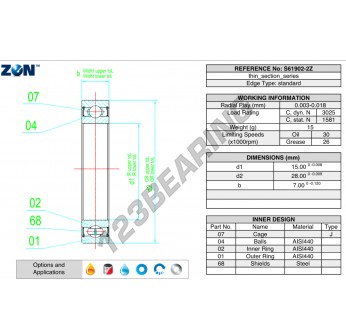 Łożysko Kulkowe, znane jako S61902-ZZ-ZEN ZEN, ma średnicę wewnętrzną 15mm, średnicę zewnętrzną 28mm i grubość 7mm.