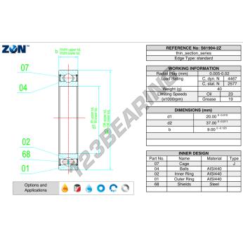 Łożysko Kulkowe, znane jako S61904-2Z-ZEN ZEN, ma średnicę wewnętrzną 20mm, średnicę zewnętrzną 37mm i grubość 9mm.