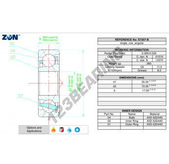 Łożysko Kulkowe, znane jako S7207-B-ZEN ZEN, ma średnicę wewnętrzną 35mm, średnicę zewnętrzną 72mm i grubość 17mm.