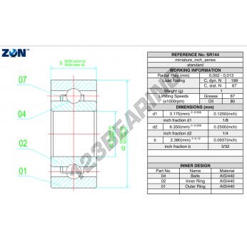 Łożysko Kulkowe, znane jako SR144-ZEN ZEN, ma średnicę wewnętrzną 3.2mm, średnicę zewnętrzną 6.4mm i grubość 2.4mm.