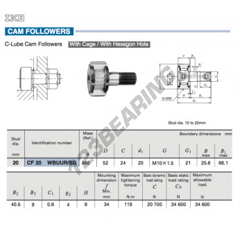 Popychacz Krzywkowy, znany pod numerem referencyjnym CF20-WBUUR-SG-IKO, marki IKO, ma średnicę wewnętrzną 20mm, średnicę zewnętrzną 52mm oraz grubość 24mm.