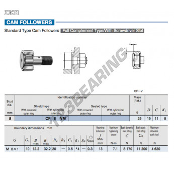 Popychacz Krzywkowy, znany pod numerem referencyjnym CF8-VM-IKO, marki IKO, ma średnicę wewnętrzną 8mm, średnicę zewnętrzną 19mm oraz grubość 11mm.