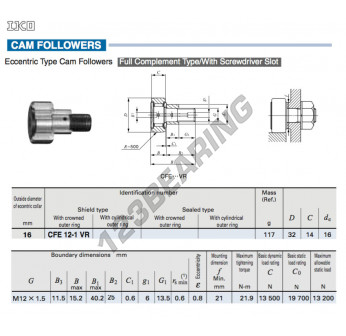 Popychacz Krzywkowy, znany pod numerem referencyjnym CFE12-1-VR-IKO, marki IKO, ma średnicę wewnętrzną 16mm, średnicę zewnętrzną 32mm oraz grubość 14mm.