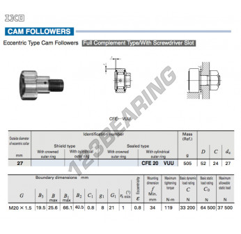 Popychacz Krzywkowy, znany pod numerem referencyjnym CFE20-VUU-IKO, marki IKO, ma średnicę wewnętrzną 27mm, średnicę zewnętrzną 52mm oraz grubość 24mm.