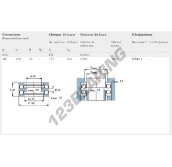 Łożysko Kulkowe Wzdłużne, znana pod numerem referencyjnym 52411-SKF, marki SKF, ma średnicę wewnętrzną 45mm, średnicę zewnętrzną 120mm oraz grubość 87mm.