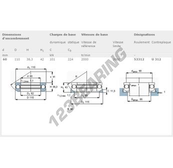 Łożysko Kulkowe Wzdłużne, znana pod numerem referencyjnym 53312-SKF, marki SKF, ma średnicę wewnętrzną 60mm, średnicę zewnętrzną 110mm oraz grubość 38.3mm.