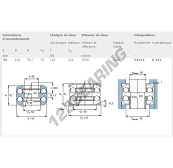 Łożysko Kulkowe Wzdłużne, znana pod numerem referencyjnym 54312-SKF, marki SKF, ma średnicę wewnętrzną 50mm, średnicę zewnętrzną 110mm oraz grubość 70.7mm.