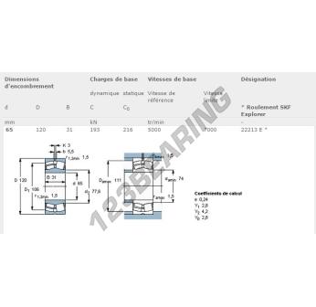 Łożysko Baryłkowe, znany pod numerem referencyjnym 22213-E-SKF, marki SKF, ma średnicę wewnętrzną 65 mm, średnicę zewnętrzną 120 mm oraz grubość 31 mm.