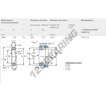 Łożysko Stożkowe, znany pod numerem referencyjnym 30232J2-SKF, marki SKF, posiada wewnętrzną średnicę 160mm, zewnętrzną średnicę 290mm oraz grubość 52mm.