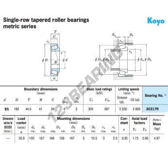 Łożysko Stożkowe, znany pod numerem referencyjnym 30317-R-JTEKT, marki JTEKT, posiada wewnętrzną średnicę 85mm, zewnętrzną średnicę 180mm oraz grubość 44.5mm.
