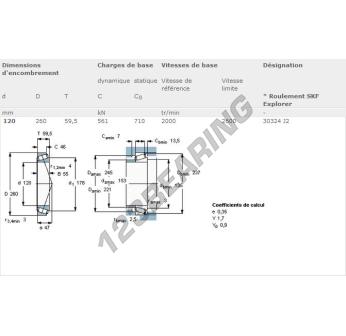 Łożysko Stożkowe, znany pod numerem referencyjnym 30324-J2-SKF, marki SKF, posiada wewnętrzną średnicę 120mm, zewnętrzną średnicę 260mm oraz grubość 59.5mm.