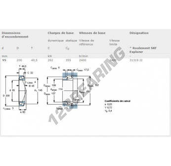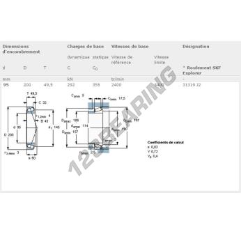 Łożysko Stożkowe, znany pod numerem referencyjnym 31319-J2-SKF, marki SKF, posiada wewnętrzną średnicę 95mm, zewnętrzną średnicę 200mm oraz grubość 49.5mm.