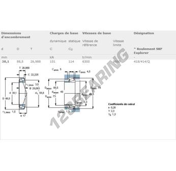 Łożysko Stożkowe, znany pod numerem referencyjnym 418-414-Q-SKF, marki SKF, posiada wewnętrzną średnicę 38.1mm, zewnętrzną średnicę 88.5mm oraz grubość 26.99mm.