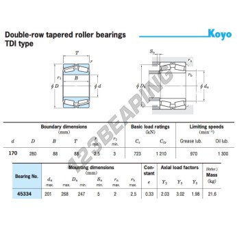 Łożysko Stożkowe, znany pod numerem referencyjnym 45334-JTEKT, marki JTEKT, posiada wewnętrzną średnicę 170mm, zewnętrzną średnicę 280mm oraz grubość 88mm.