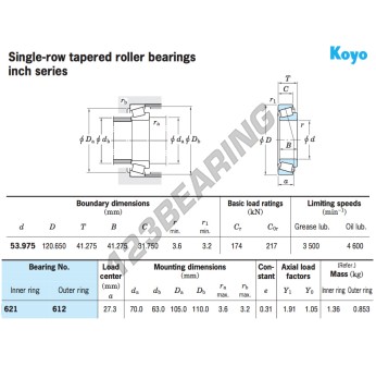 Łożysko Stożkowe, znany pod numerem referencyjnym 621-612-JTEKT, marki JTEKT, posiada wewnętrzną średnicę 53.975mm, zewnętrzną średnicę 120.65mm oraz grubość 41.275mm.