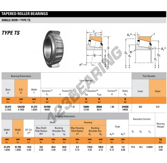 Łożysko Stożkowe, znany pod numerem referencyjnym 624-612-TIMKEN, marki TIMKEN, posiada wewnętrzną średnicę 53.975mm, zewnętrzną średnicę 120.65mm oraz grubość 41.275mm.