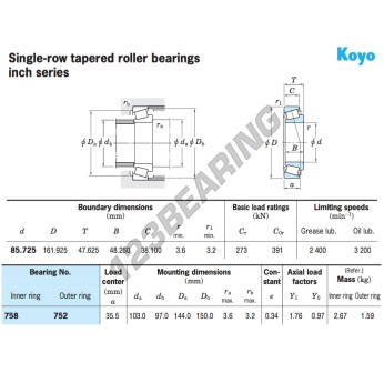 Łożysko Stożkowe, znany pod numerem referencyjnym 758-752-JTEKT, marki JTEKT, posiada wewnętrzną średnicę 85.725mm, zewnętrzną średnicę 161.925mm oraz grubość 47.625mm.
