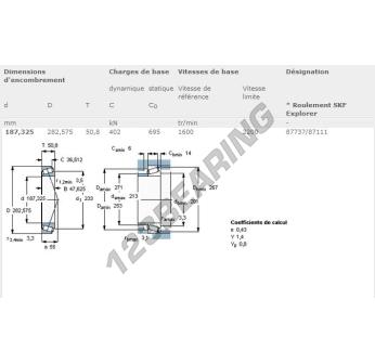 Łożysko Stożkowe, znany pod numerem referencyjnym 87737-87111-SKF, marki SKF, posiada wewnętrzną średnicę 187.33mm, zewnętrzną średnicę 282.58mm oraz grubość 50.8mm.