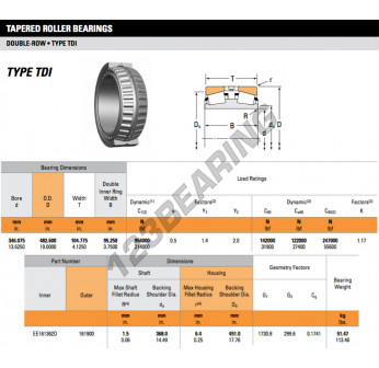 Łożysko Stożkowe, znany pod numerem referencyjnym EE161362D-161900-TIMKEN, marki TIMKEN, posiada wewnętrzną średnicę 346.075mm, zewnętrzną średnicę 482.6mm oraz grubość 104.775mm.
