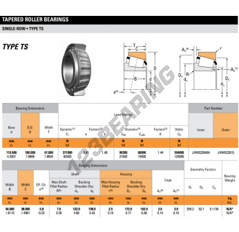 Łożysko Stożkowe, znany pod numerem referencyjnym JHM522649A-JHM522610-TIMKEN, marki TIMKEN, posiada wewnętrzną średnicę 110mm, zewnętrzną średnicę 180mm oraz grubość 47mm.