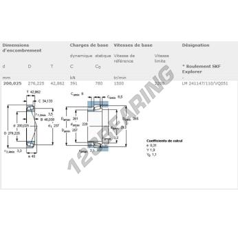 Łożysko Stożkowe, znany pod numerem referencyjnym LM241147-LM241110-VQ051-SKF, marki SKF, posiada wewnętrzną średnicę 200.025mm, zewnętrzną średnicę 276.225mm oraz grubość 46.038mm.