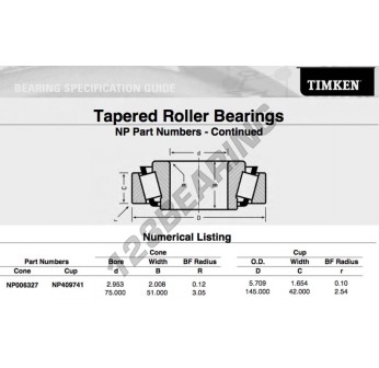 Łożysko Stożkowe, znany pod numerem referencyjnym NP006327-NP409741-TIMKEN, marki TIMKEN, posiada wewnętrzną średnicę 75mm, zewnętrzną średnicę 145mm oraz grubość 51mm.