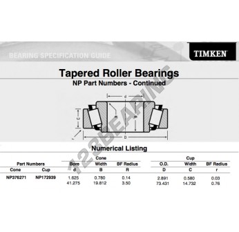 Łożysko Stożkowe, znany pod numerem referencyjnym NP376271-NP172939-TIMKEN, marki TIMKEN, posiada wewnętrzną średnicę 41.275mm, zewnętrzną średnicę 73.431mm oraz grubość 19.812mm.