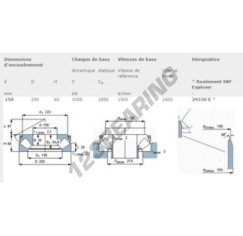 Łożysko Wałeczkowe Wzdłużne, o numerze referencyjnym 29330-E-SKF, marki SKF, posiada średnicę wewnętrzną 150 mm, średnicę zewnętrzną 250 mm oraz grubość 60 mm.