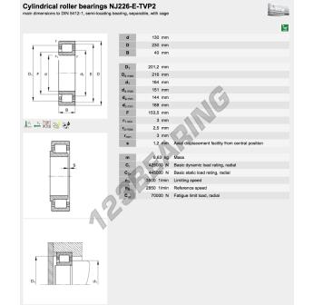 Łożysko Wałeczkowe, znany pod numerem referencyjnym NJ226-E-XL-TVP2-FAG, marki FAG, posiada średnicę wewnętrzną 130 mm, średnicę zewnętrzną 230 mm oraz grubość 40 mm.