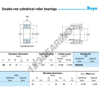 Łożysko Wałeczkowe, znany pod numerem referencyjnym NN3006-JTEKT, marki JTEKT, posiada średnicę wewnętrzną 30 mm, średnicę zewnętrzną 55 mm oraz grubość 19 mm.