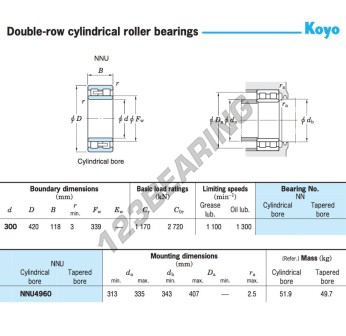 Łożysko Wałeczkowe, znany pod numerem referencyjnym NNU4960-KOYO, marki JTEKT, posiada średnicę wewnętrzną 300 mm, średnicę zewnętrzną 420 mm oraz grubość 118 mm.