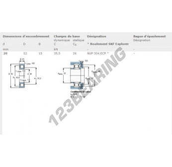 Łożysko Wałeczkowe, znany pod numerem referencyjnym NUP304-ECP-SKF, marki SKF, posiada średnicę wewnętrzną 20 mm, średnicę zewnętrzną 52 mm oraz grubość 15 mm.