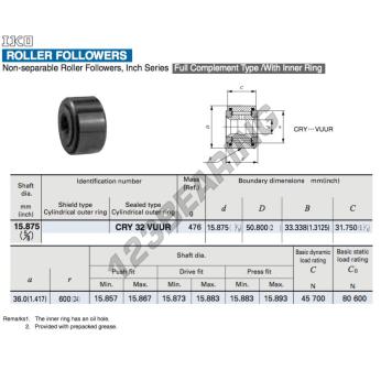 Rolka Bieżna Typu Jarzmowego, znany pod numerem referencyjnym CRY32-VUUR-IKO, marki IKO, posiada średnicę wewnętrzną 15.875 mm, średnicę zewnętrzną 50.8 mm oraz grubość 33.338 mm.