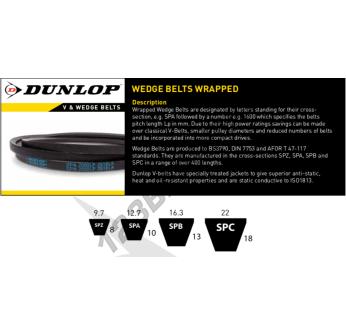 Przekładnia pasowa SPC4100-DUNLOP z rodziny Pasek Klinowy Owijany, marki DUNLOP i profilu SPC. Ma przekrój 22mm x 18mm o długości wewnętrznej 4017 mm, długości zewnętrznej 4130 mm i długości podziałowej 4100 mm.